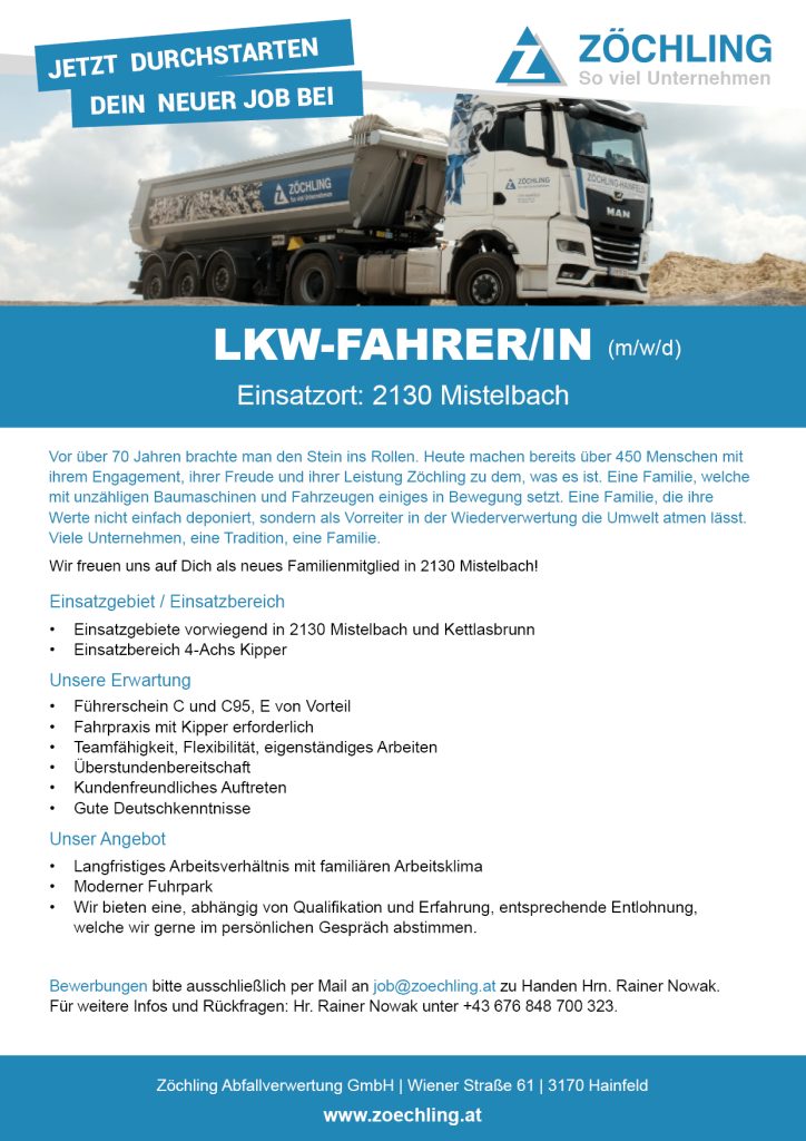 Bewerbungen bitte ausschließlich per Mail an job@zoechling.at zu Handen Hrn. Rainer Nowak.