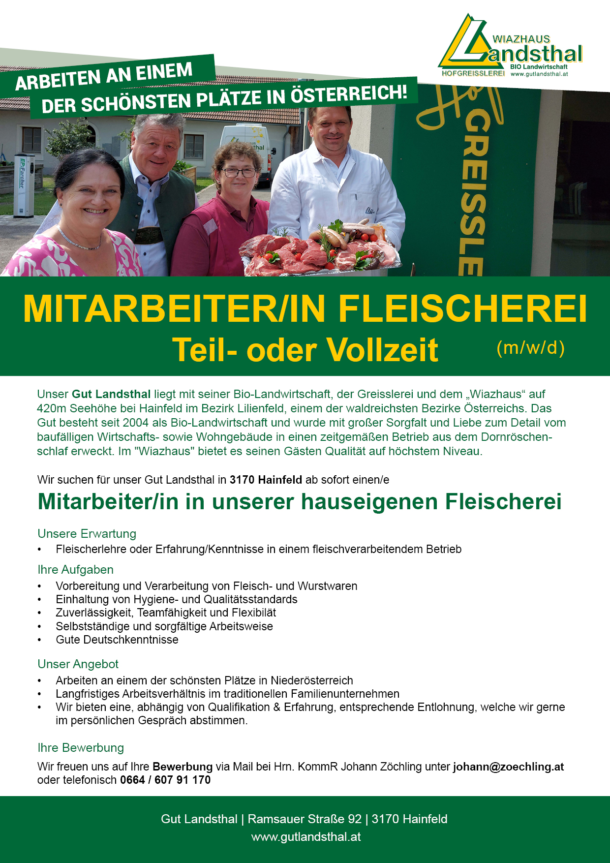 Wir freuen uns auf Ihre Bewerbung via Mail bei Hrn. KommR Johann Zöchling unter johann@zoechling.at oder telefonisch bei Fr. Natascha Gruber unter 0664 / 607 91 430